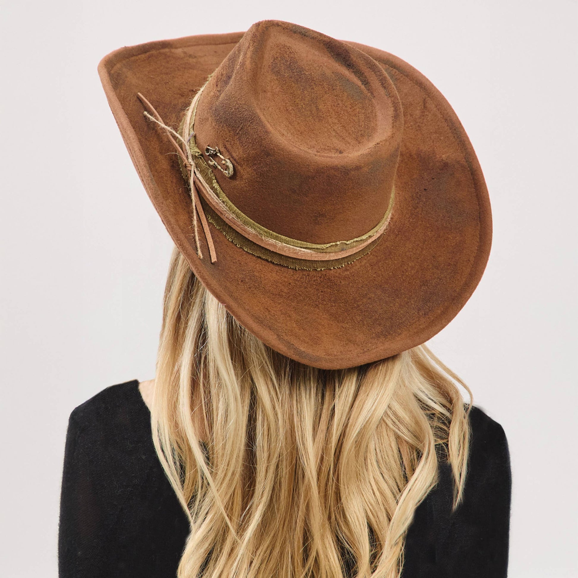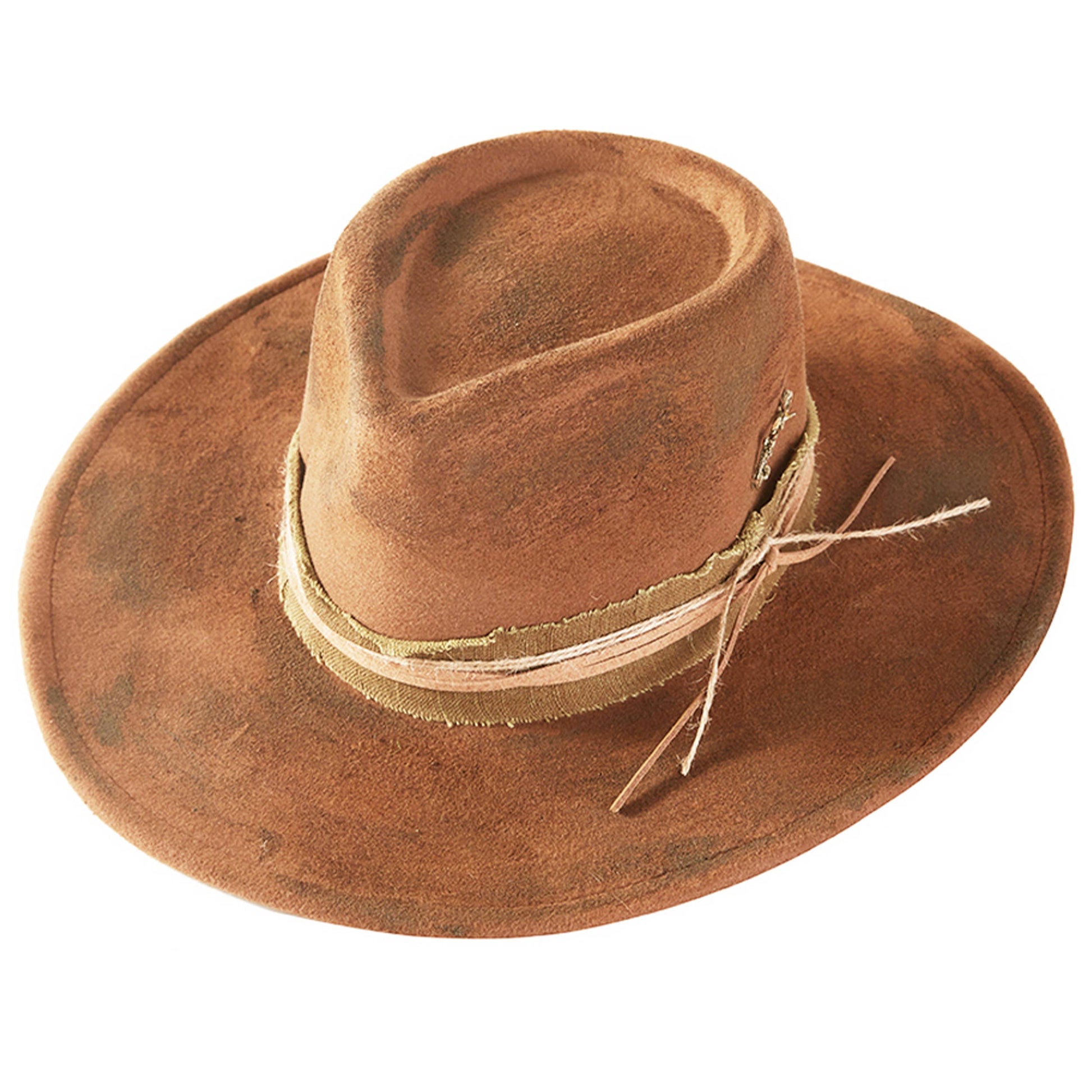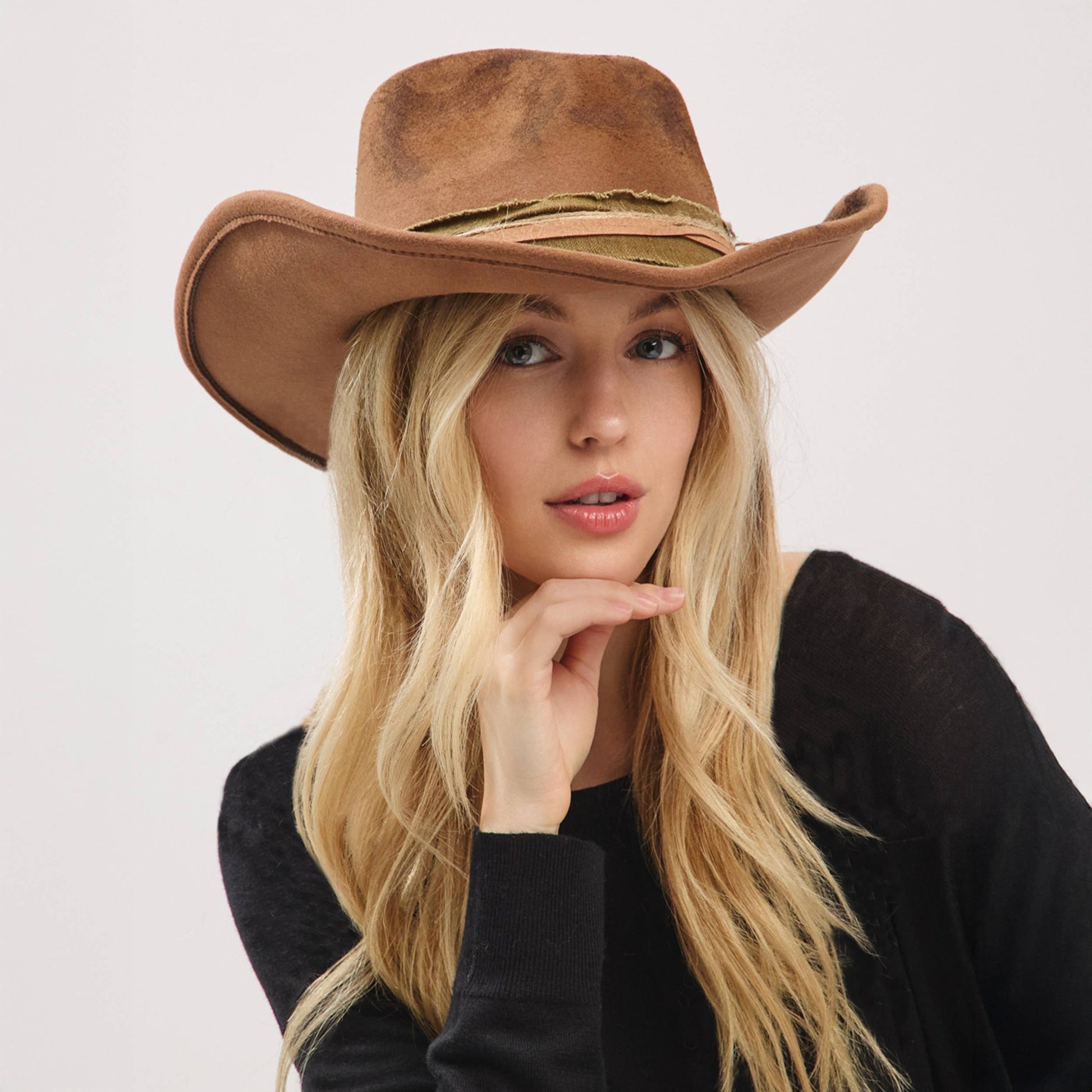 Rustic Cowgirl Fedora Hat with Distressed Fabric Band 100% Polyester One Size - Two iconic looks, one hat! This Cowboy Hat's flexible brim allows for effortless shaping, letting you wear it as a classic cowboy hat or style it as a contemporary fedora.