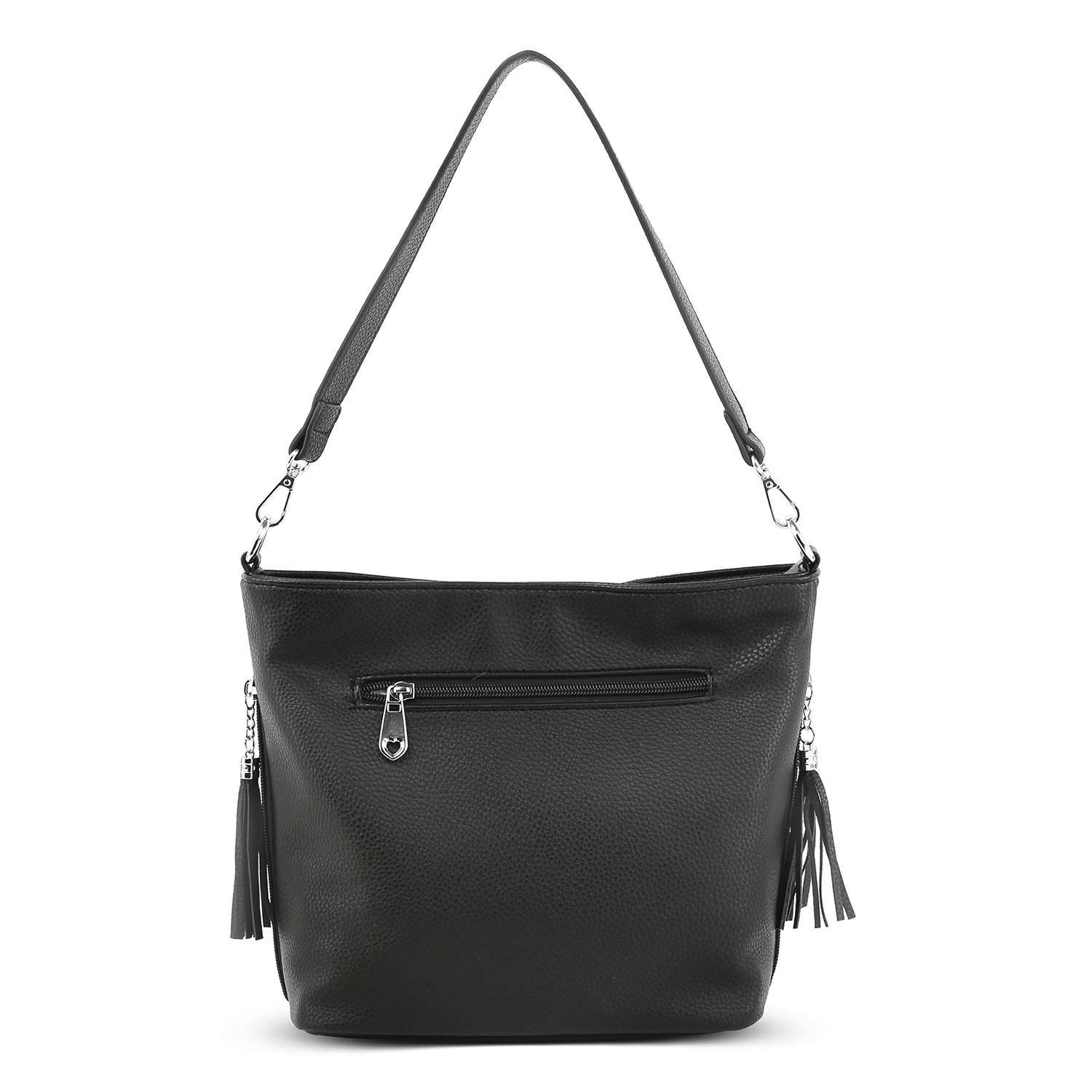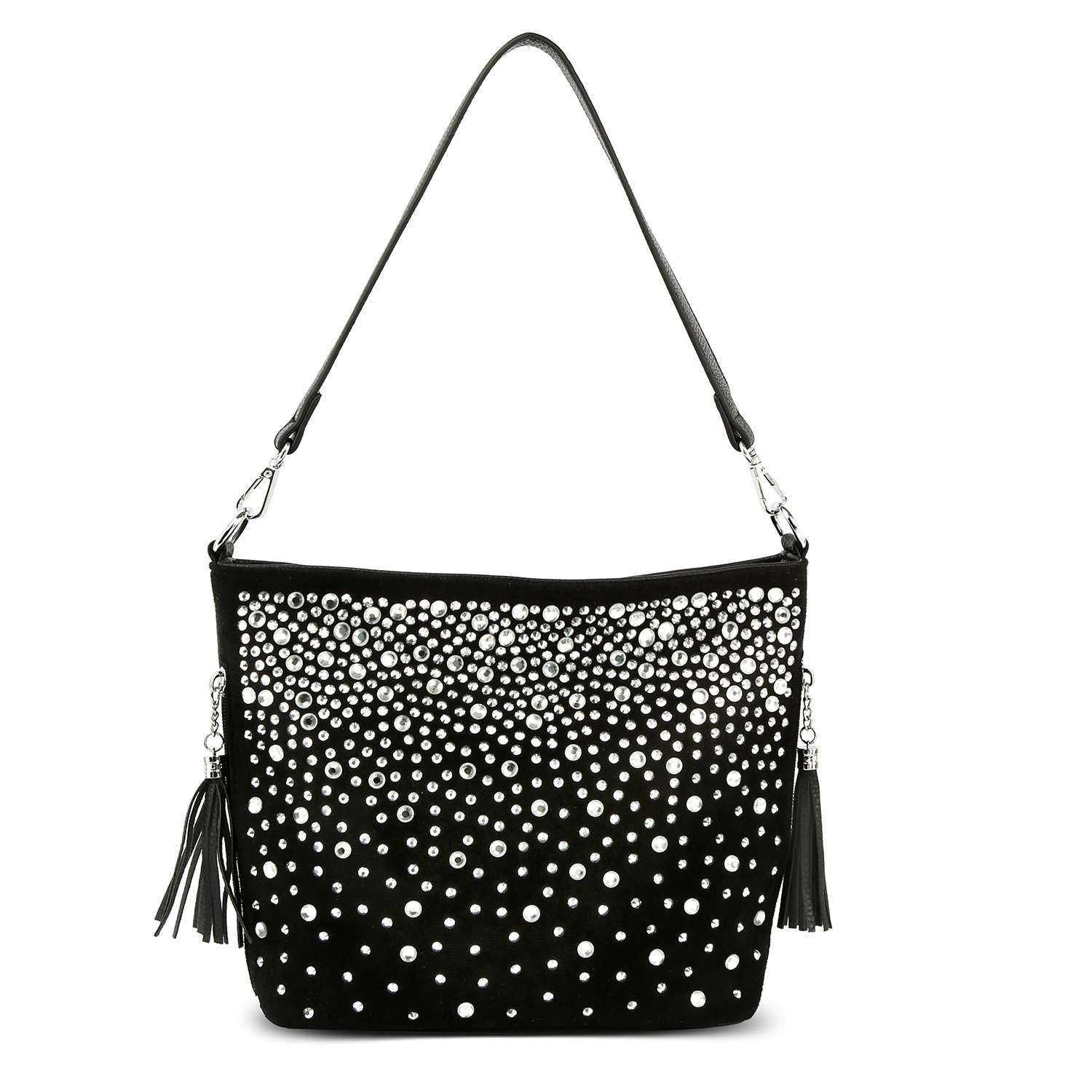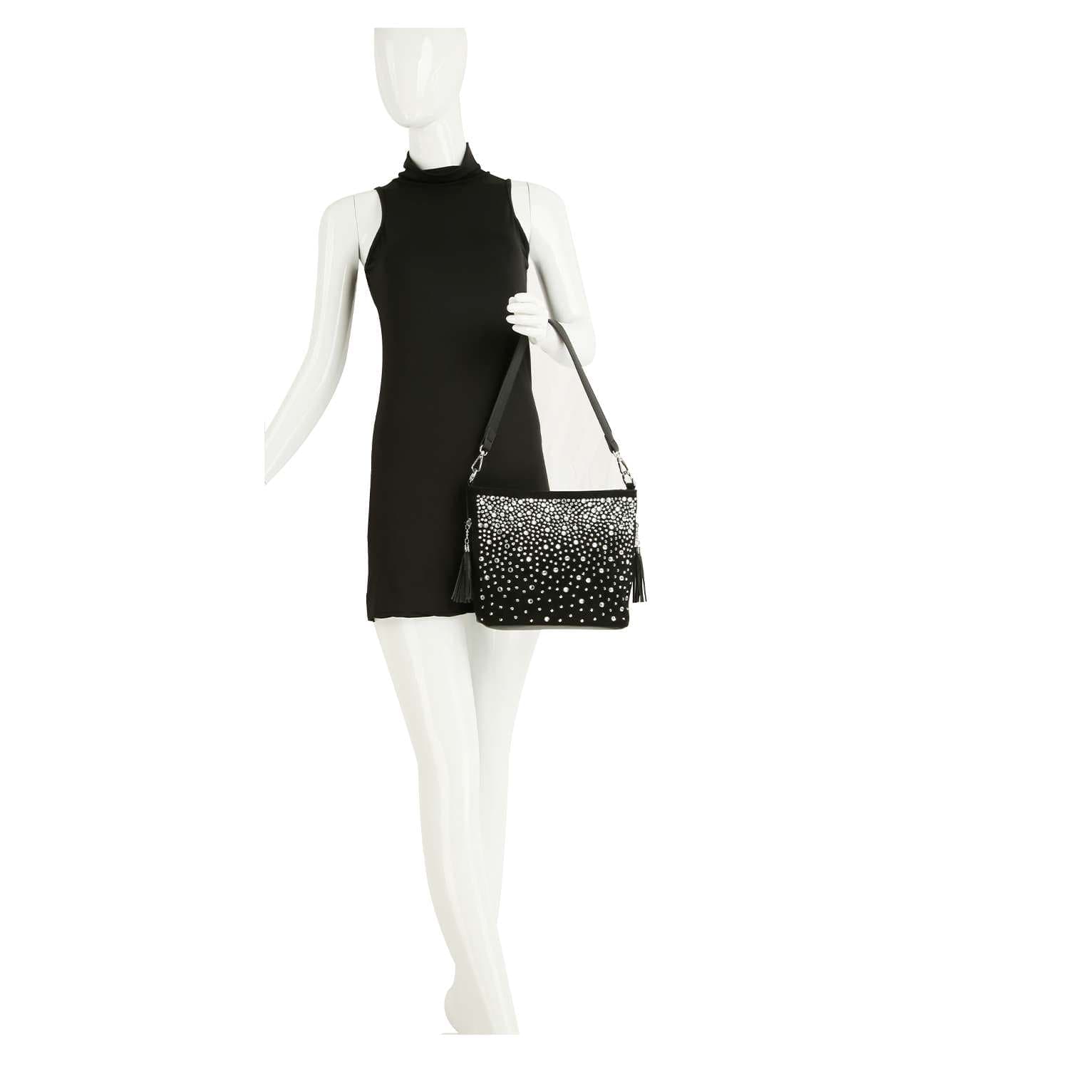 Go for full on glam! This fashion hobo doubles as a crossbody sling and is made of a soft faux leather. It features an ombre rhinestone pattern that is sure to attract attention.