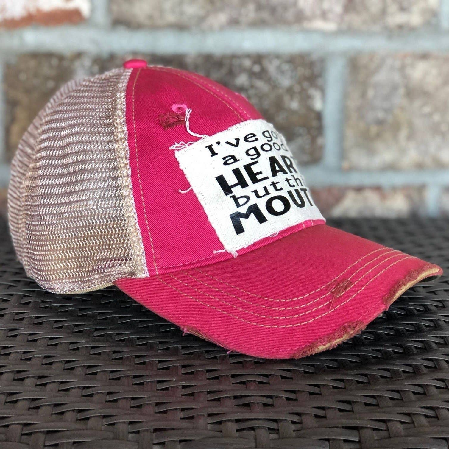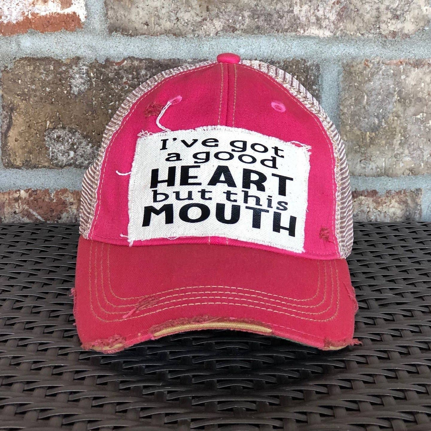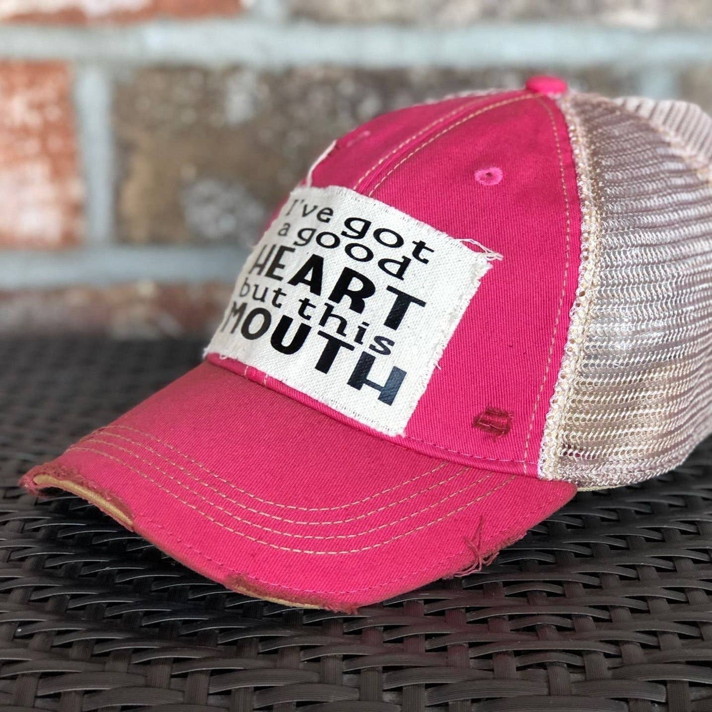 Distressed, vintage feel baseball hat. This I've Got a Good Heart, but this Mouth Cap is sure to put some happy in your day! Who knows someone like that? It is a custom creation by BohoGroove featuring a weathered snapback cap in pink and an oversized I've Got a Good Heart logo. It is sure to bring a smile to anyone who sees it.