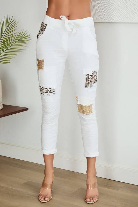 DRAWSTRING JOGGER WITH LEOPARD/ SEQUIN PATCHES