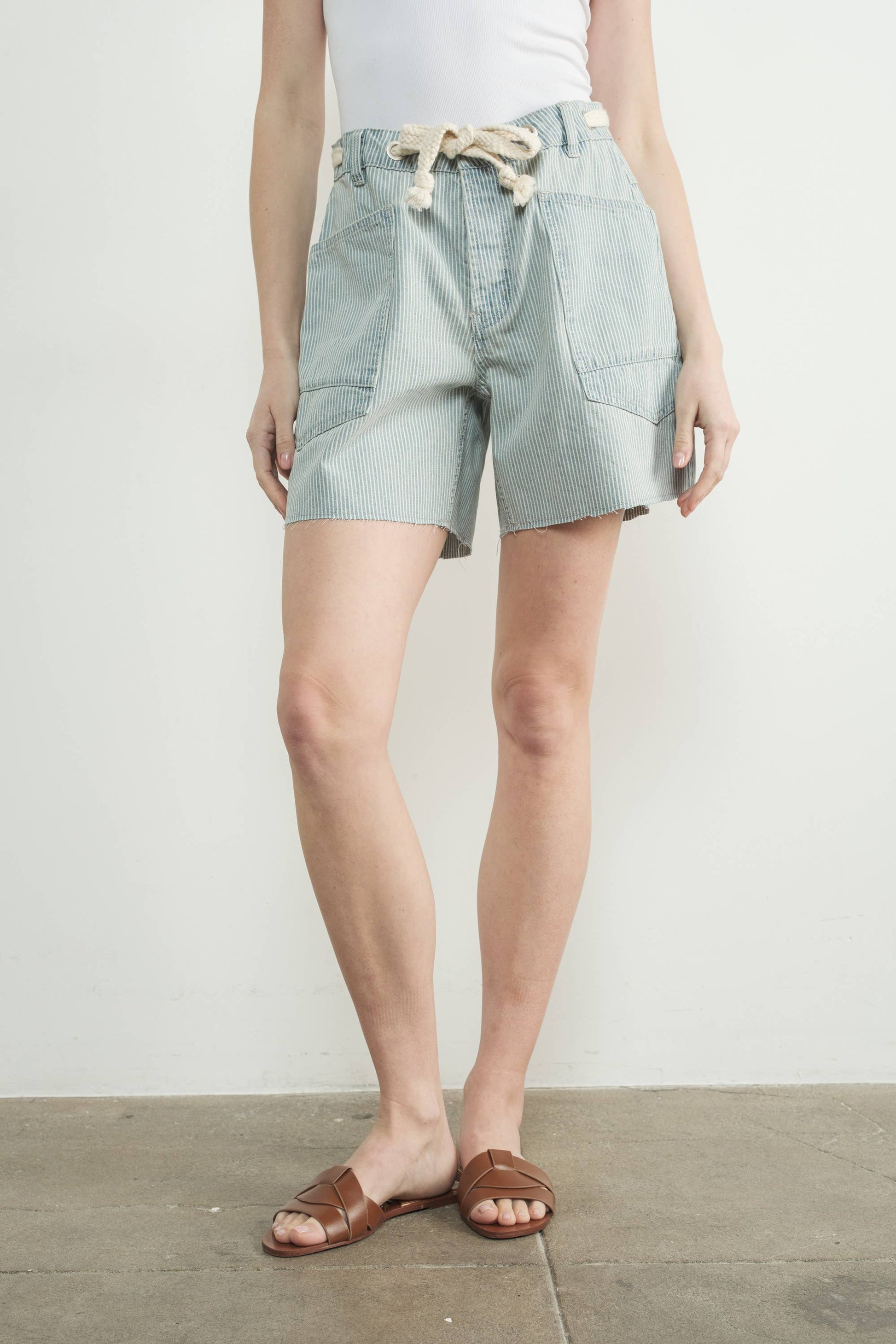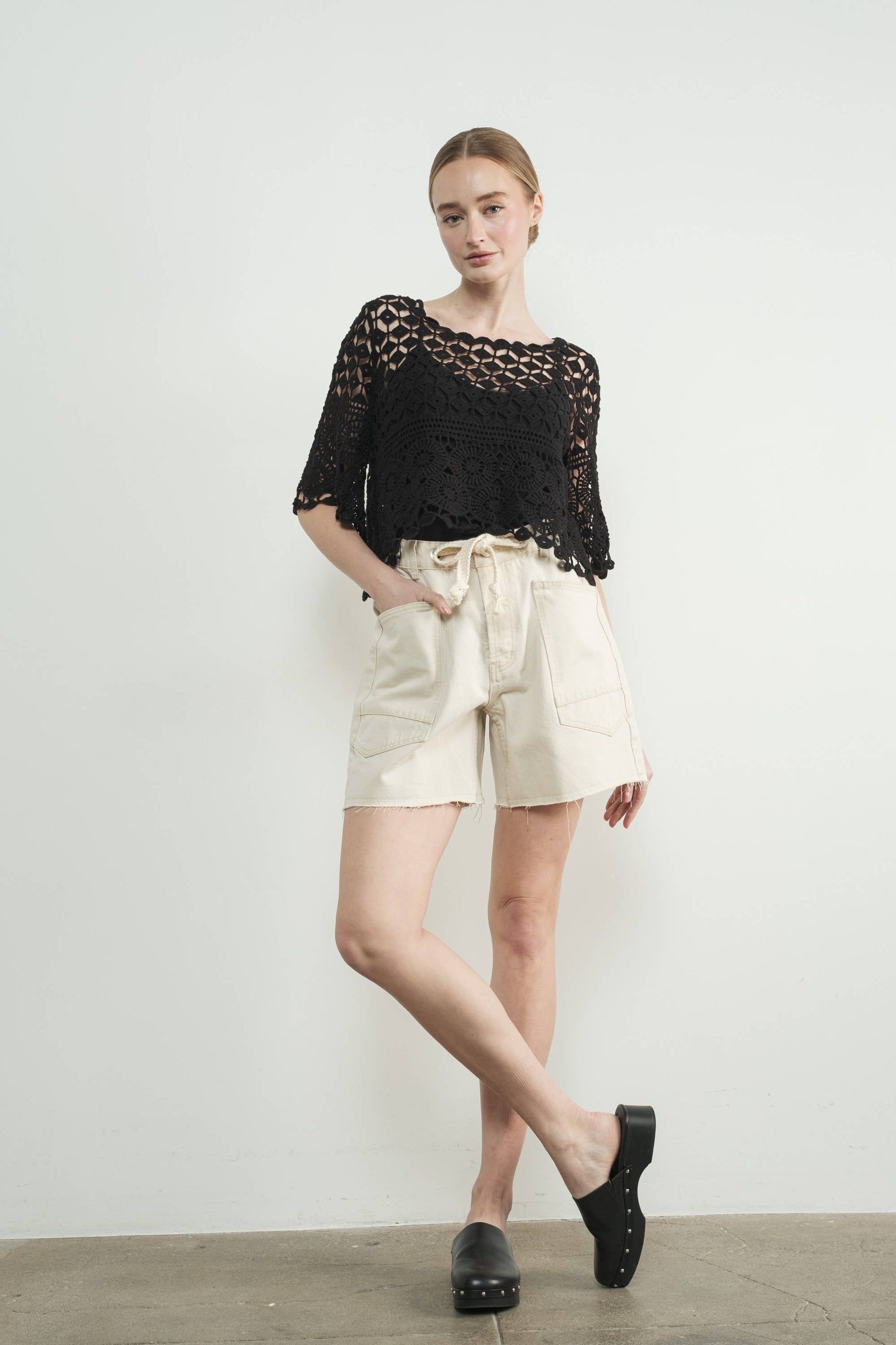 Theses jean shorts are the perfect unique pair. feature a corded drawstring waist, ,raw edge detail, deep pockets, exaggerated tapered silhouette with slouchy fit, Zip fly and button closures, oversized workwear pockets throughout.
