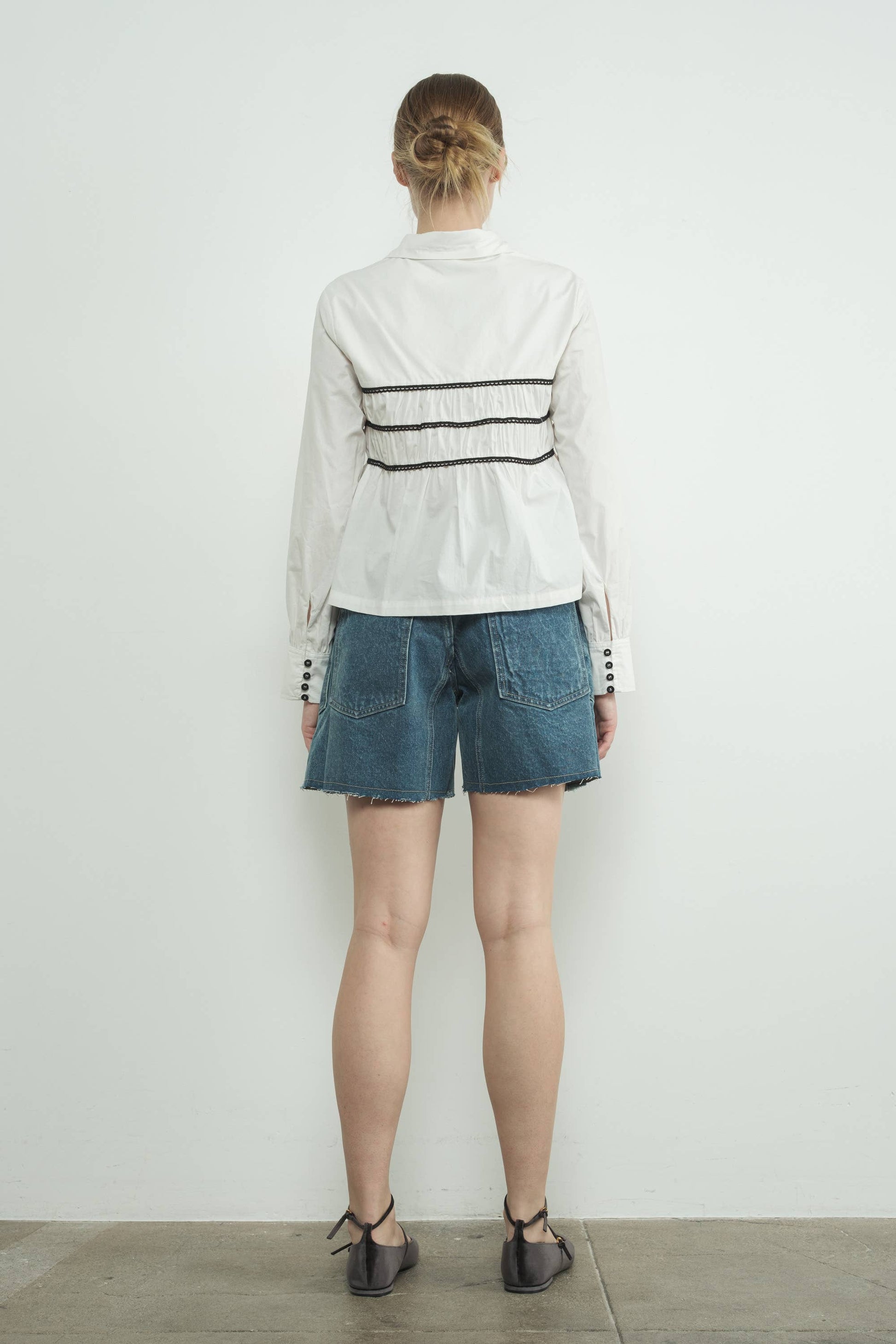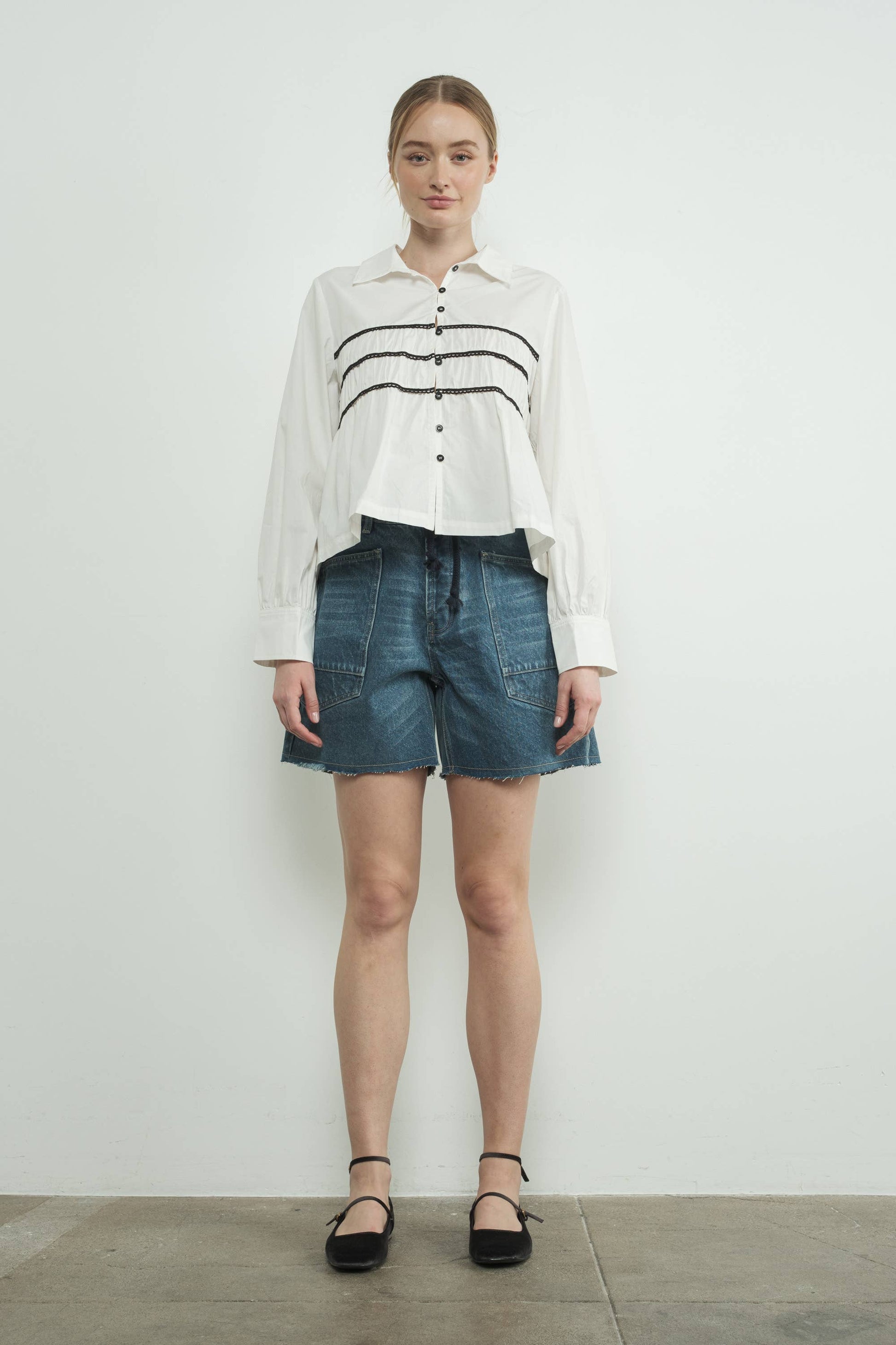 VINTAGE WASHED BARREL DENIM SHORTS W/GROMMET WAIST-SIZE DOWN