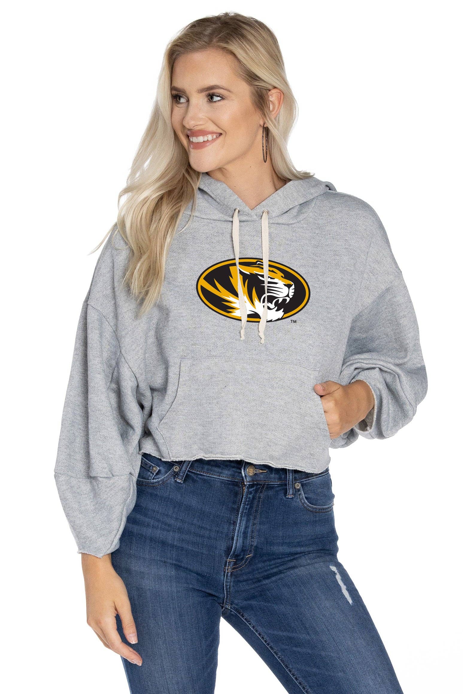 Dare to be bold with these oversized balloon sleeves. Pair this Missouri Tigers cropped hoodie with leggings for an athletic look or dress it up with some cute jeans. Features balloon sleeves, kangaroo pocket, and raw edge finish. 53% poly, 47% cotton.