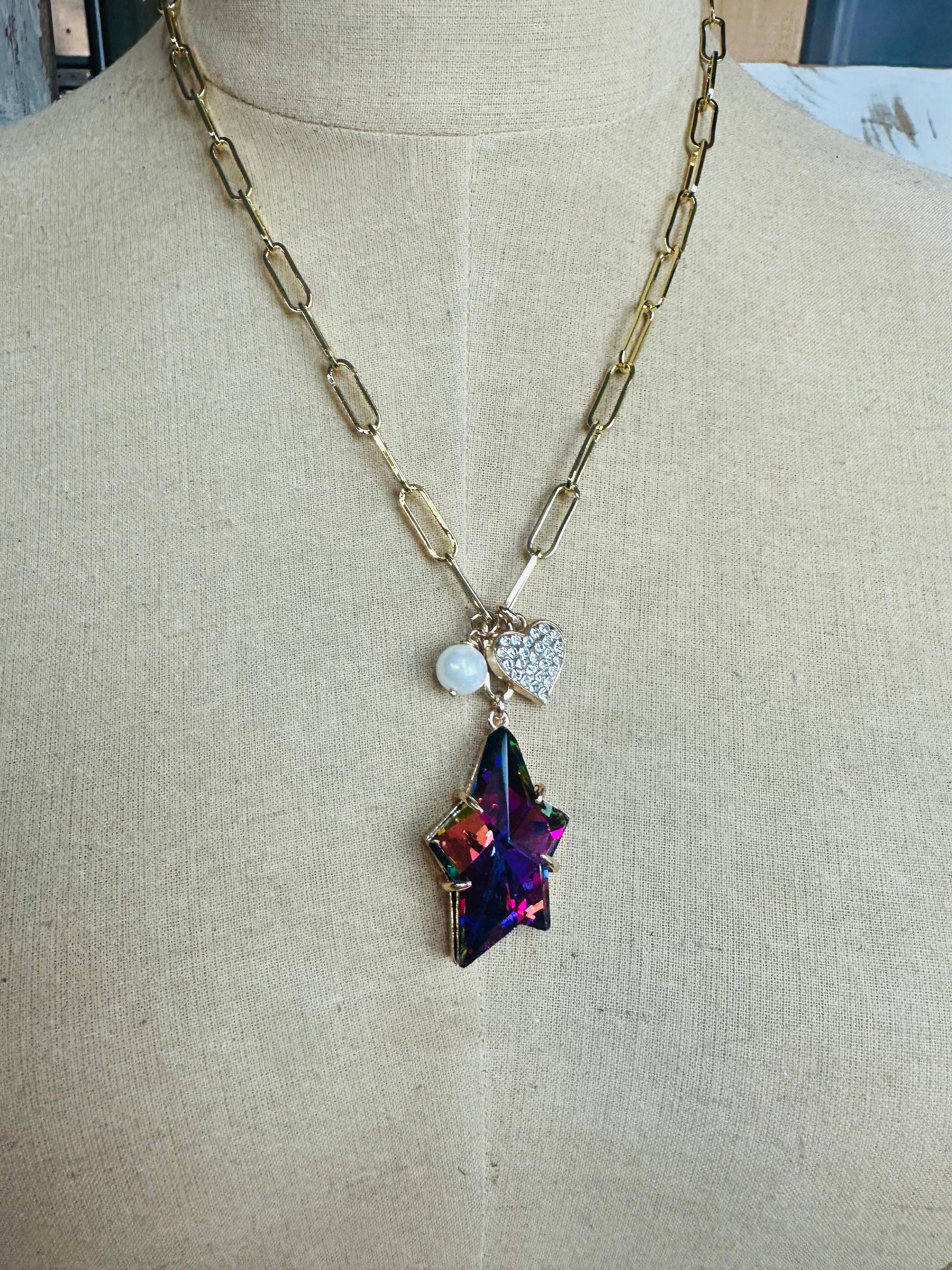 This necklace has a large prism star that changes colors in movement from pinks, purples and blues. It is set in a prong setting and it accented with a rhinestone heart and a pearl dangle. This necklace is a show stopper. The gold chain is paper clip and lasting chain. You must have this in your store it comes in two other colors.