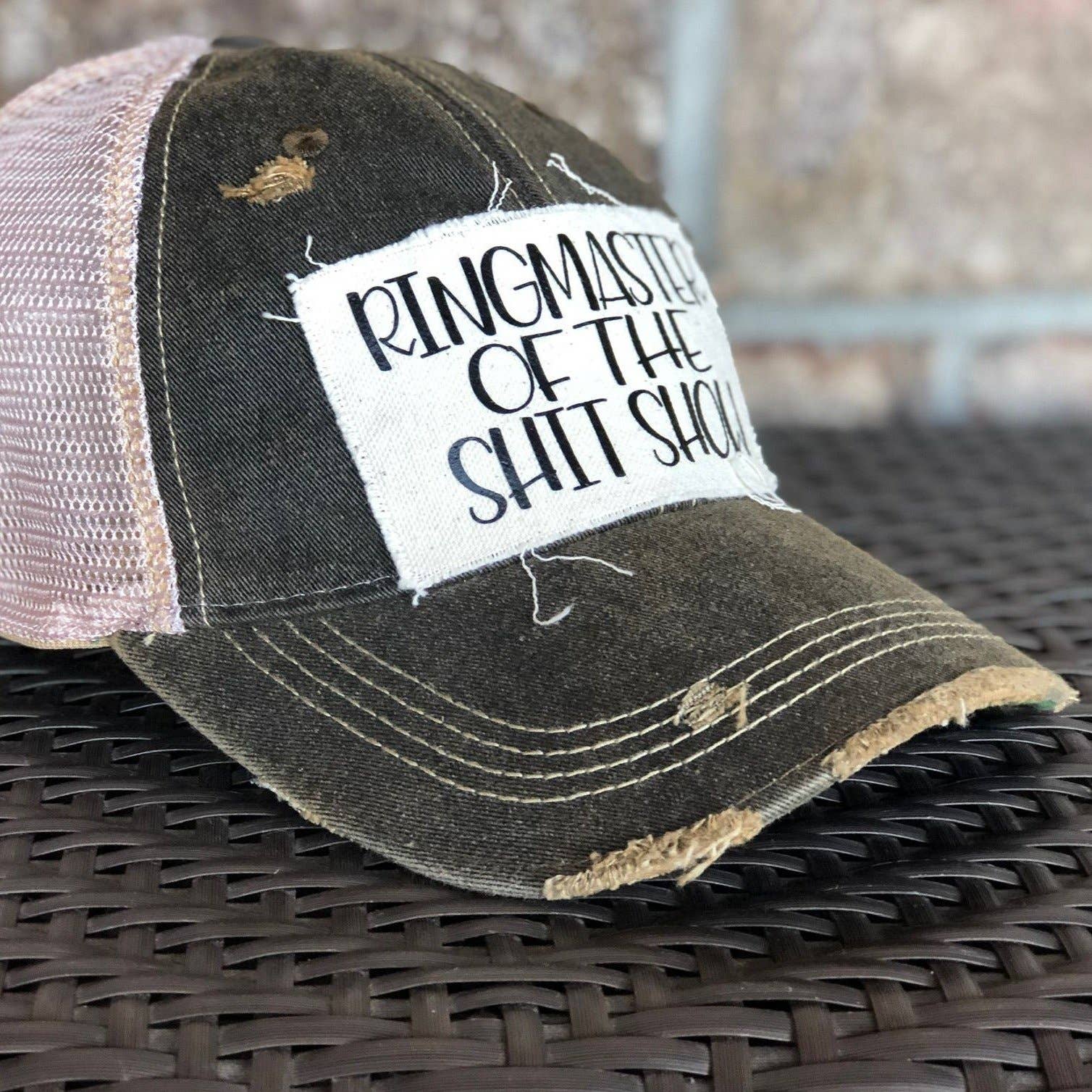 Distressed, vintage feel baseball hat. Ringmaster of the Shit Show Cap is sure to put some happy in your day! Who hasn't worn this title? It is a custom creation by BohoGroove featuring a weathered snapback cap in pink and sherbert an oversized Ringmaster logo. It is sure to bring a smile to anyone who sees it.