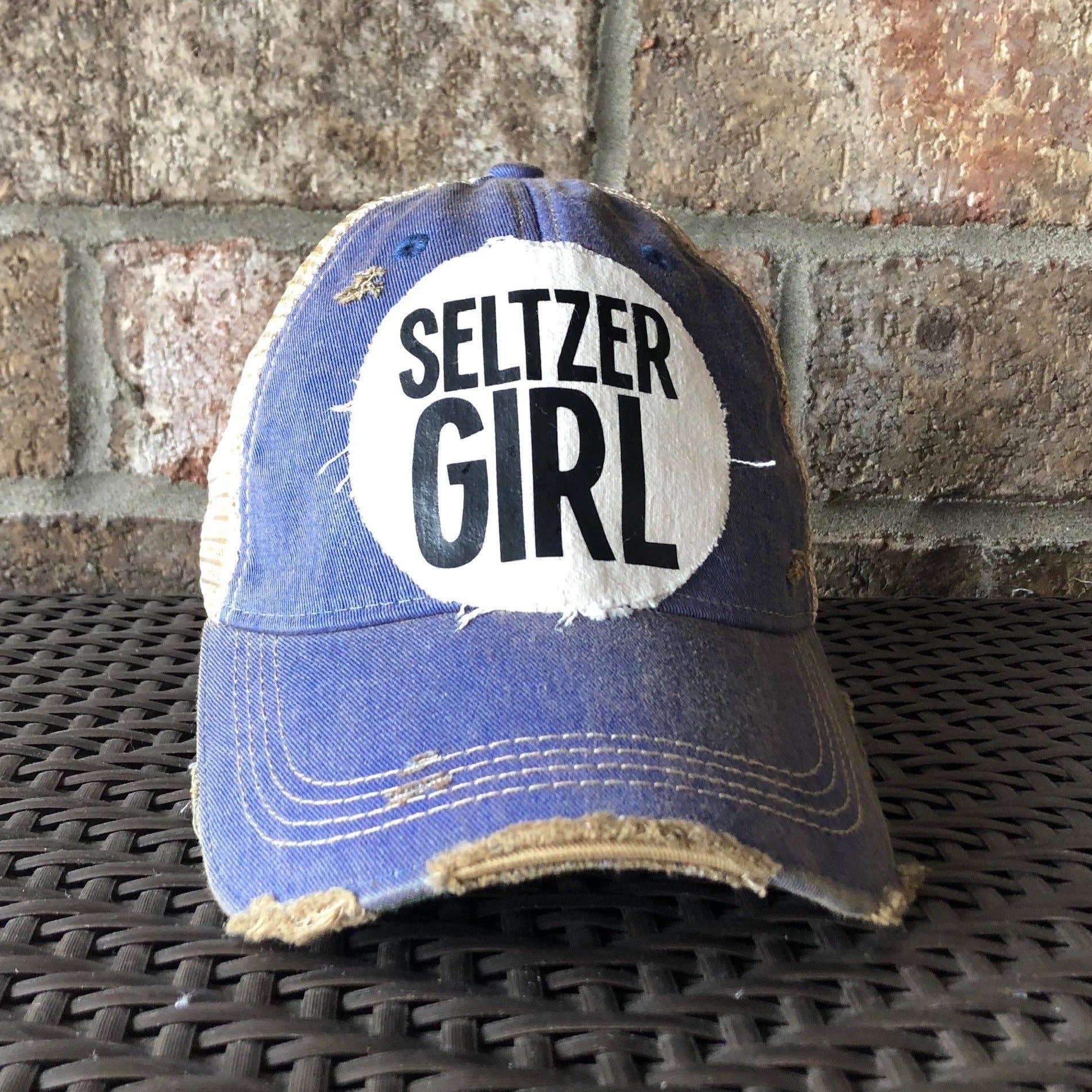 Distressed, vintage feel baseball hat. This super-soft Seltzer Girl Cap is sure to put some happy in your day! It is a custom creation by BohoGroove featuring a weathered snapback cap in purple and an oversized Seltzer Girl logo. It is simple and to the point! No excuses here.
