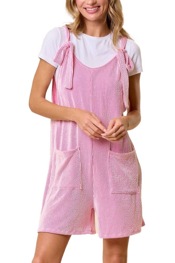 This romper is what dreams are made of. Features soft fabric, self-tying straps, and two front pocket details at front.