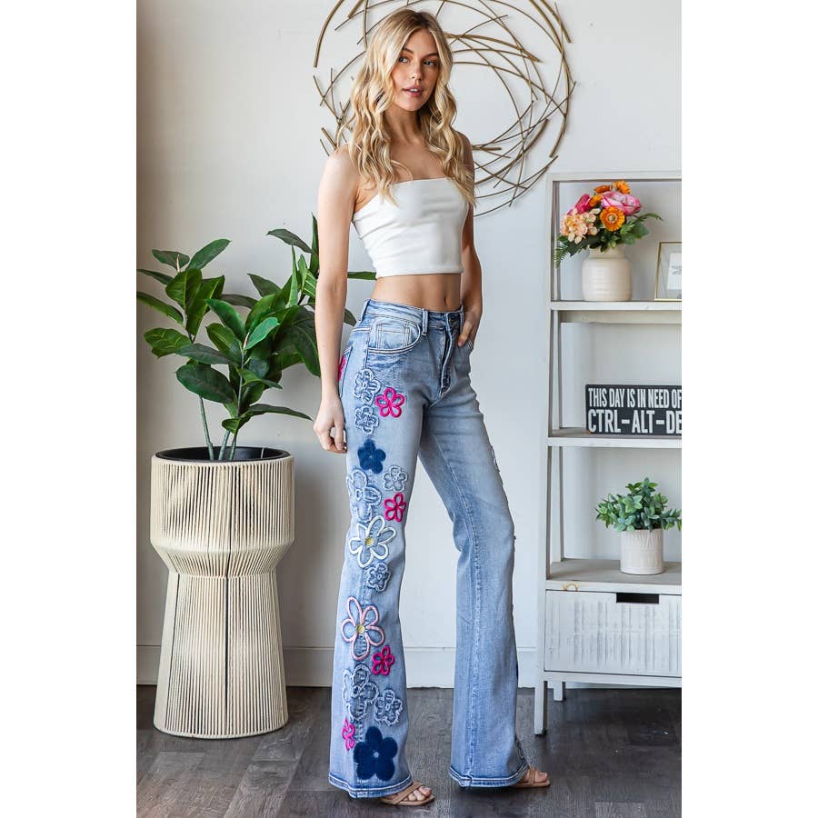 WASHED FLOWER EMBROIDERY DENIM PANTS - IMPORTED - MINERAL WASH DETAIL - RELAXED FIT - TRUE TO SIZE - OUR MODEL IS ALWAYS WEARING SIZE "S" - FABRIC CONTENT: 75% COTTON 23% POLYESTER 2% SAPNDEX